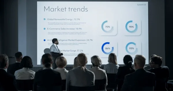 These projections wrap around the walls and instantly elevate the professional atmosphere without the need for excessive physical staging. Interactive lighting enhances the environment throughout the event — from formal pitch sessions and panel discussions to refined networking as the event concludes.